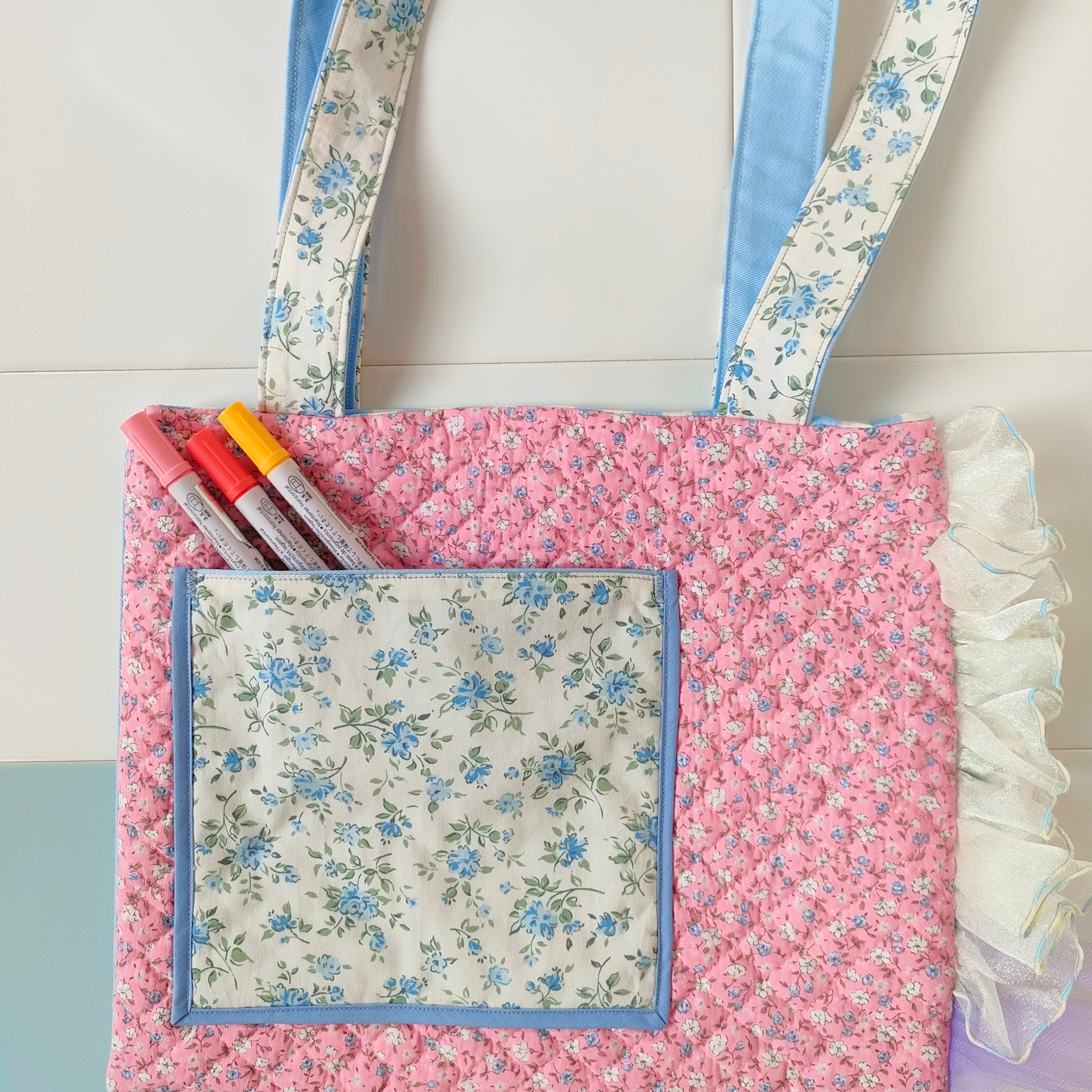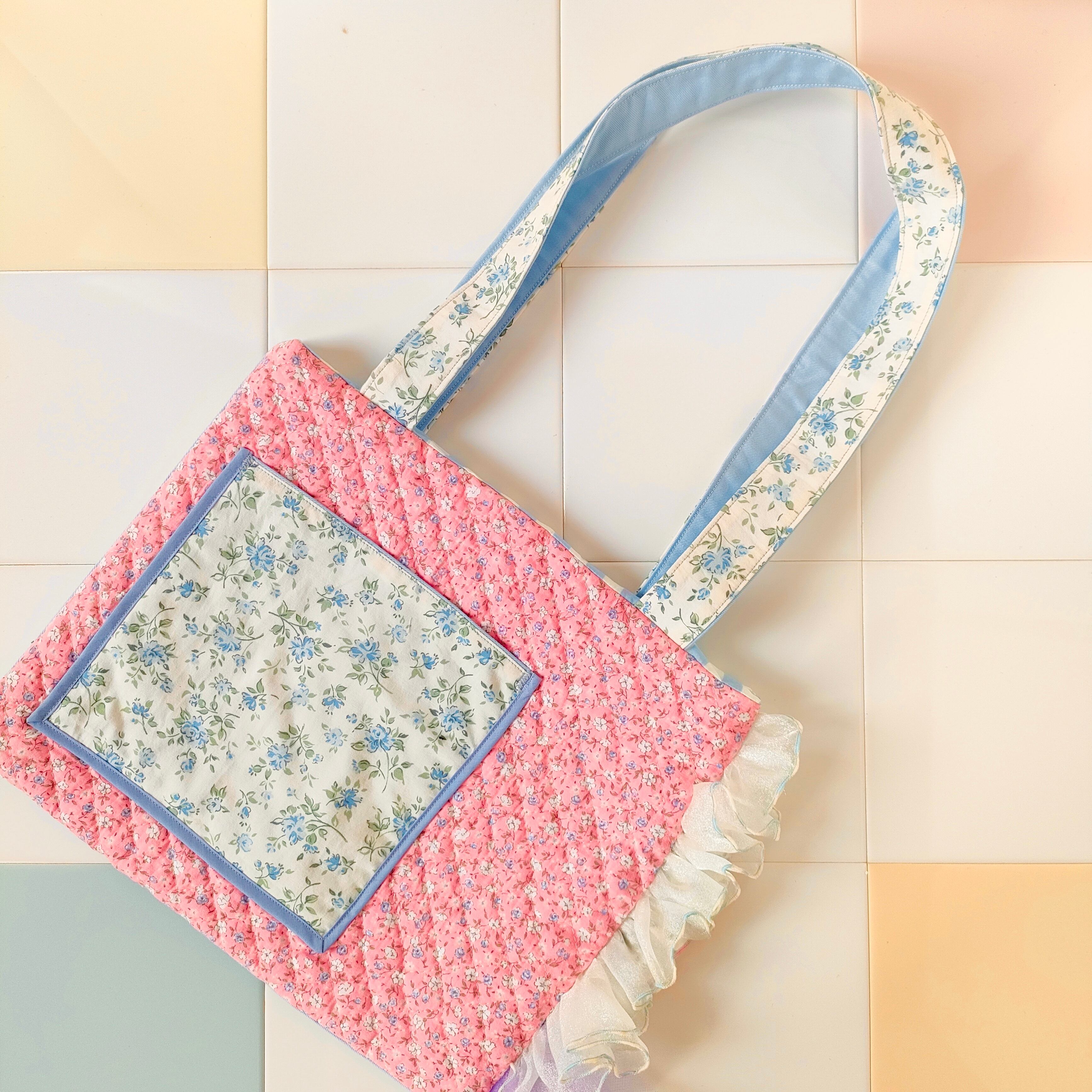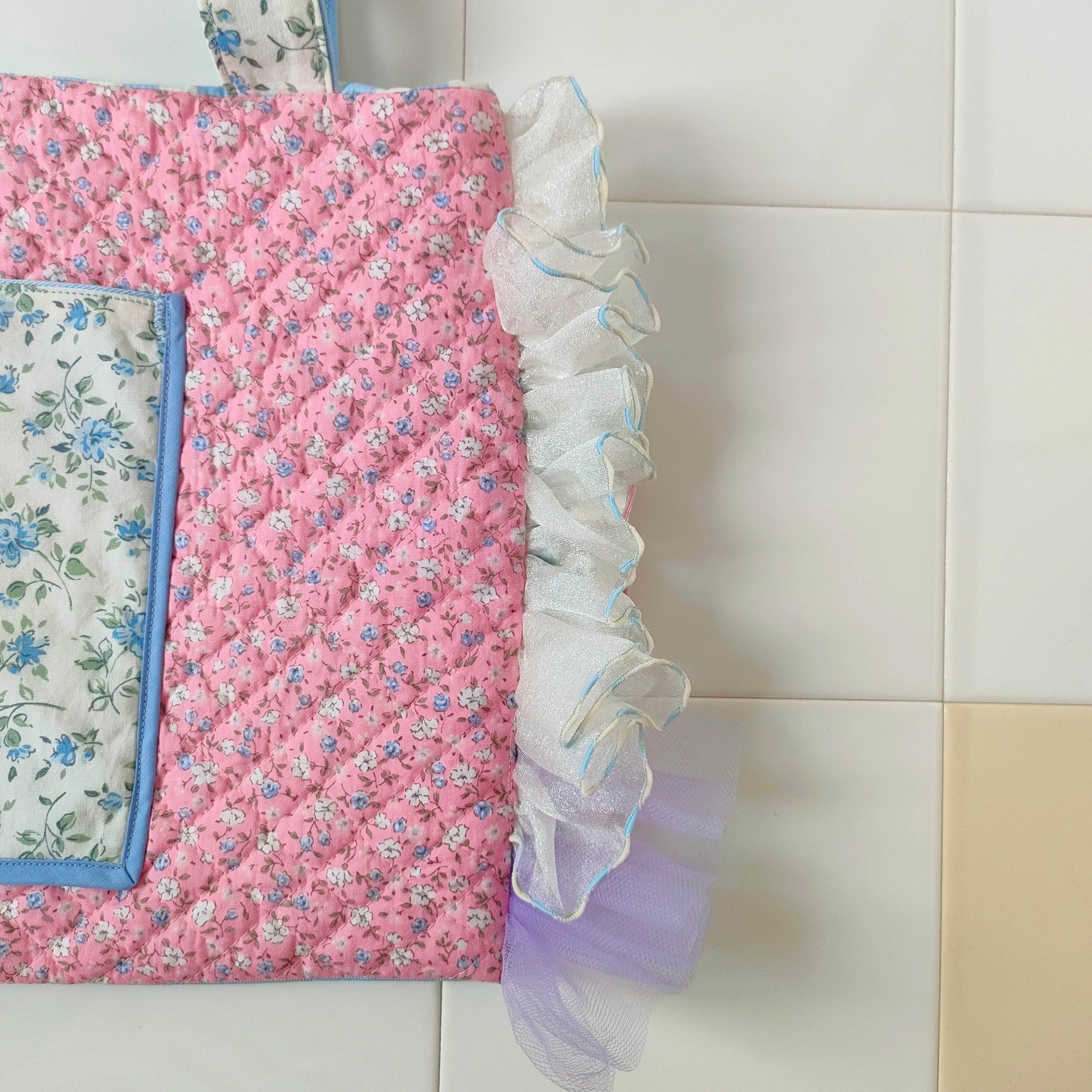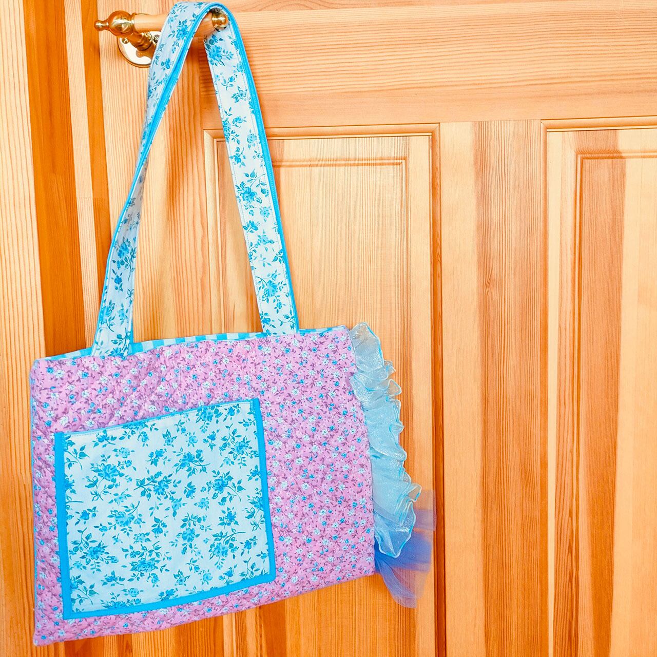 花柄キルティングとブルー小花柄のフリルトート「パリの屋根裏で見つけたお花のバッグ‧₊˚」/A4が入るサイズです♪