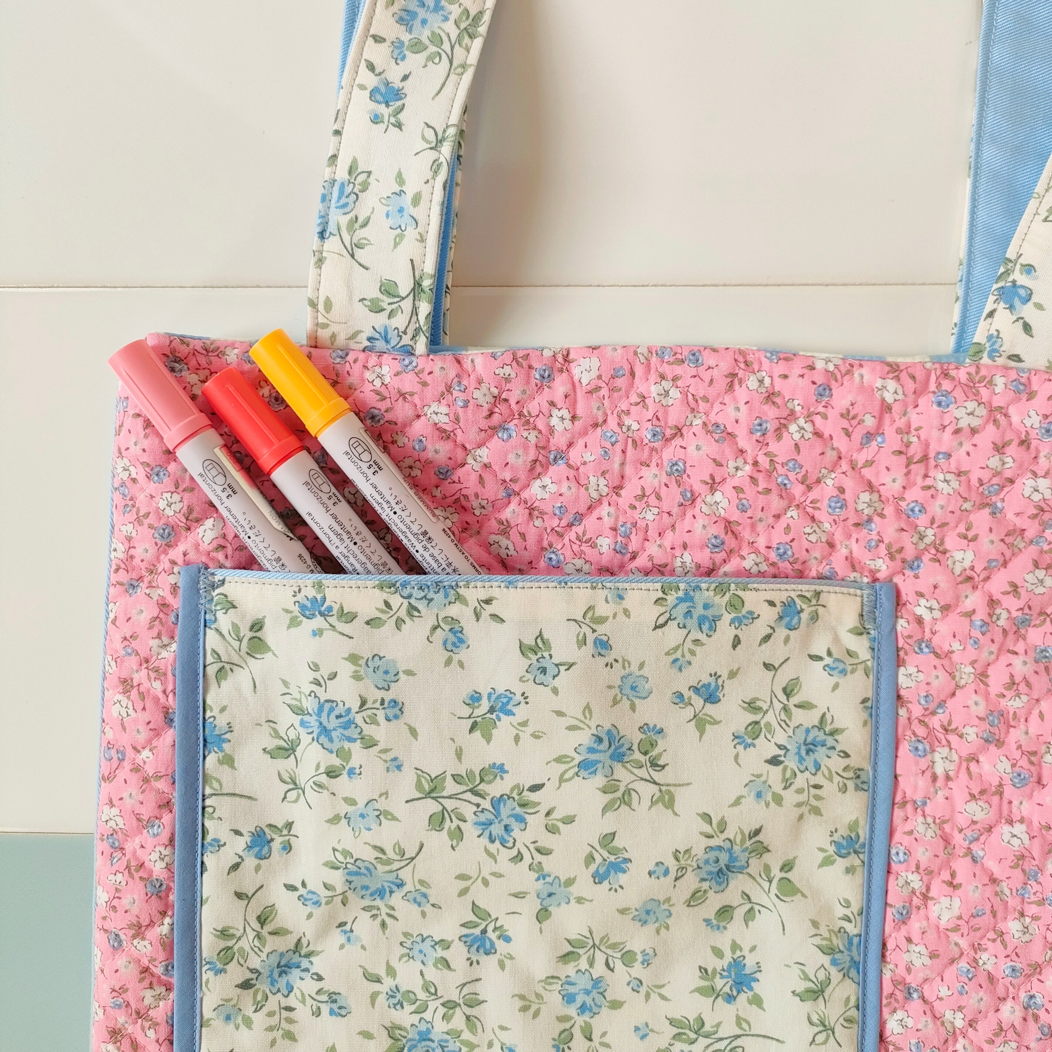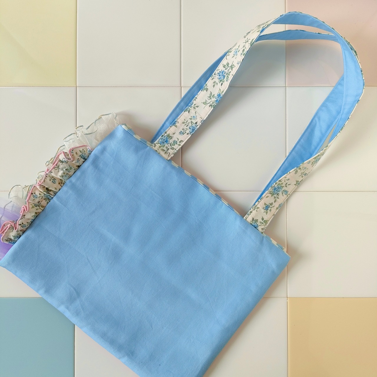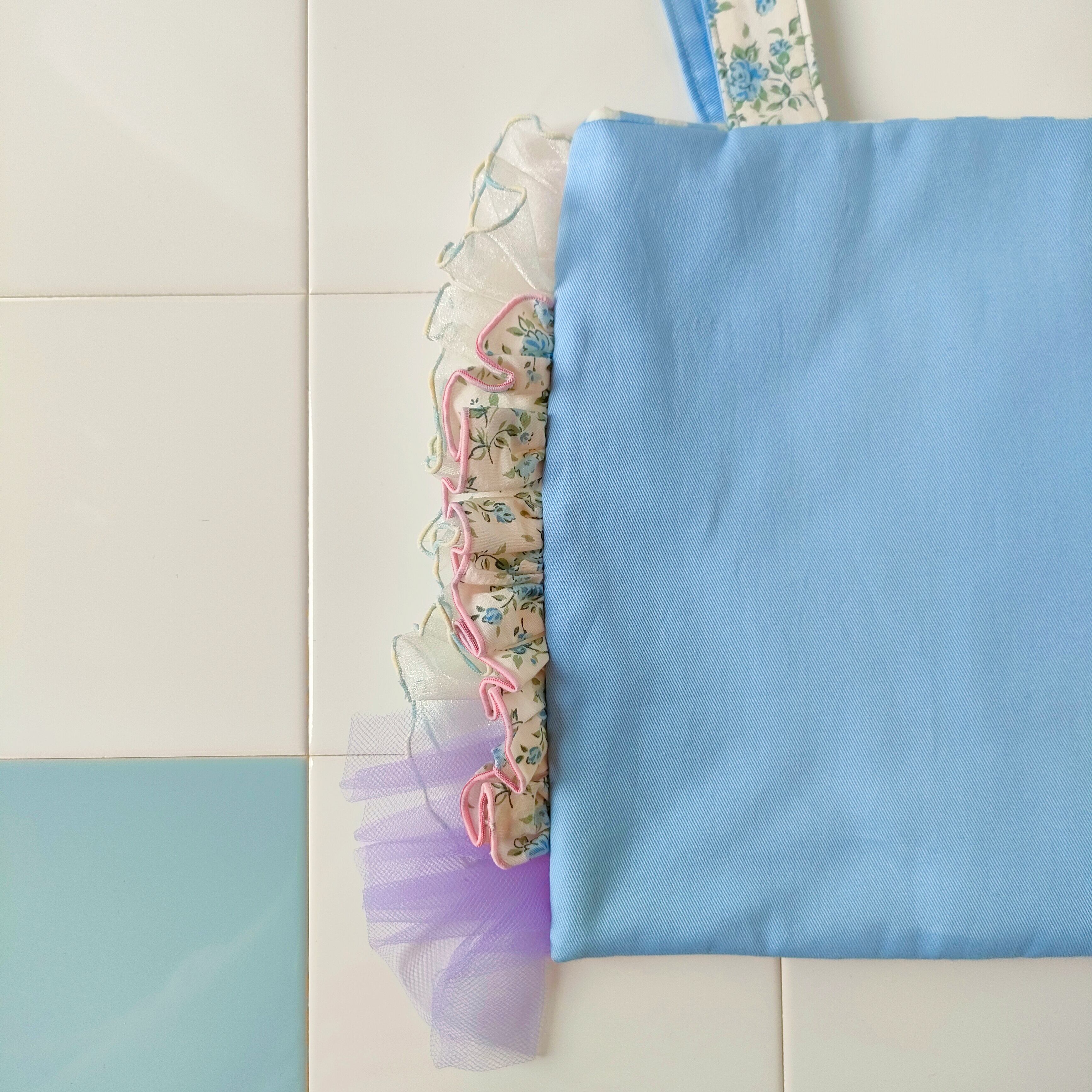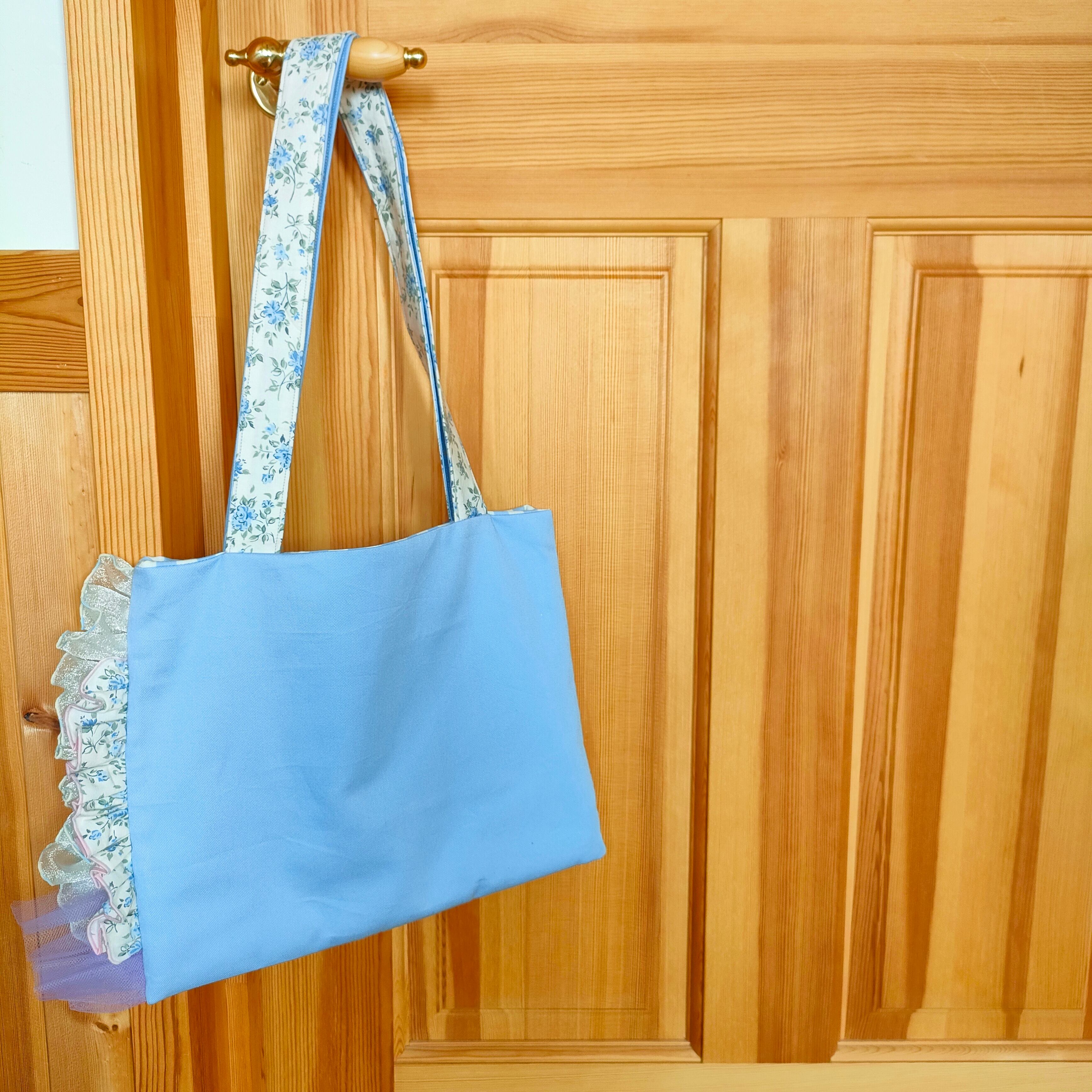 花柄キルティングとブルー小花柄のフリルトート「パリの屋根裏で見つけたお花のバッグ‧₊˚」/A4が入るサイズです♪